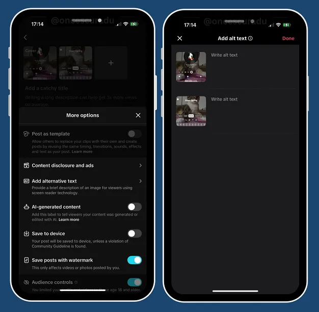 Ahogyan azt az appfejlesztő Radu Oncescu képernyőfotói is mutatják, a TikTok mostantól lehetővé teszi, hogy a képes posztok feltöltésekor szöveges leírást adjunk hozzá az egyes fotókhoz. Az „Add alternative text” opcióval egy-egy rövid mondatban megfogalmazhatjuk, mit ábrázol a kép, milyen fő elemek találhatók rajta, vagy mi a tartalom lényege.
